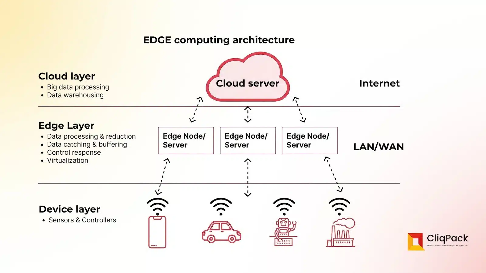 The cloud layer handles big data processing via cloud servers connected over the internet. The edge layer includes edge nodes/servers for data ingestion, buffering, virtualization, and caching, linked via LAN/WAN. Device layers consist of sensors, controllers, phones, cars, and factories sending data upward.